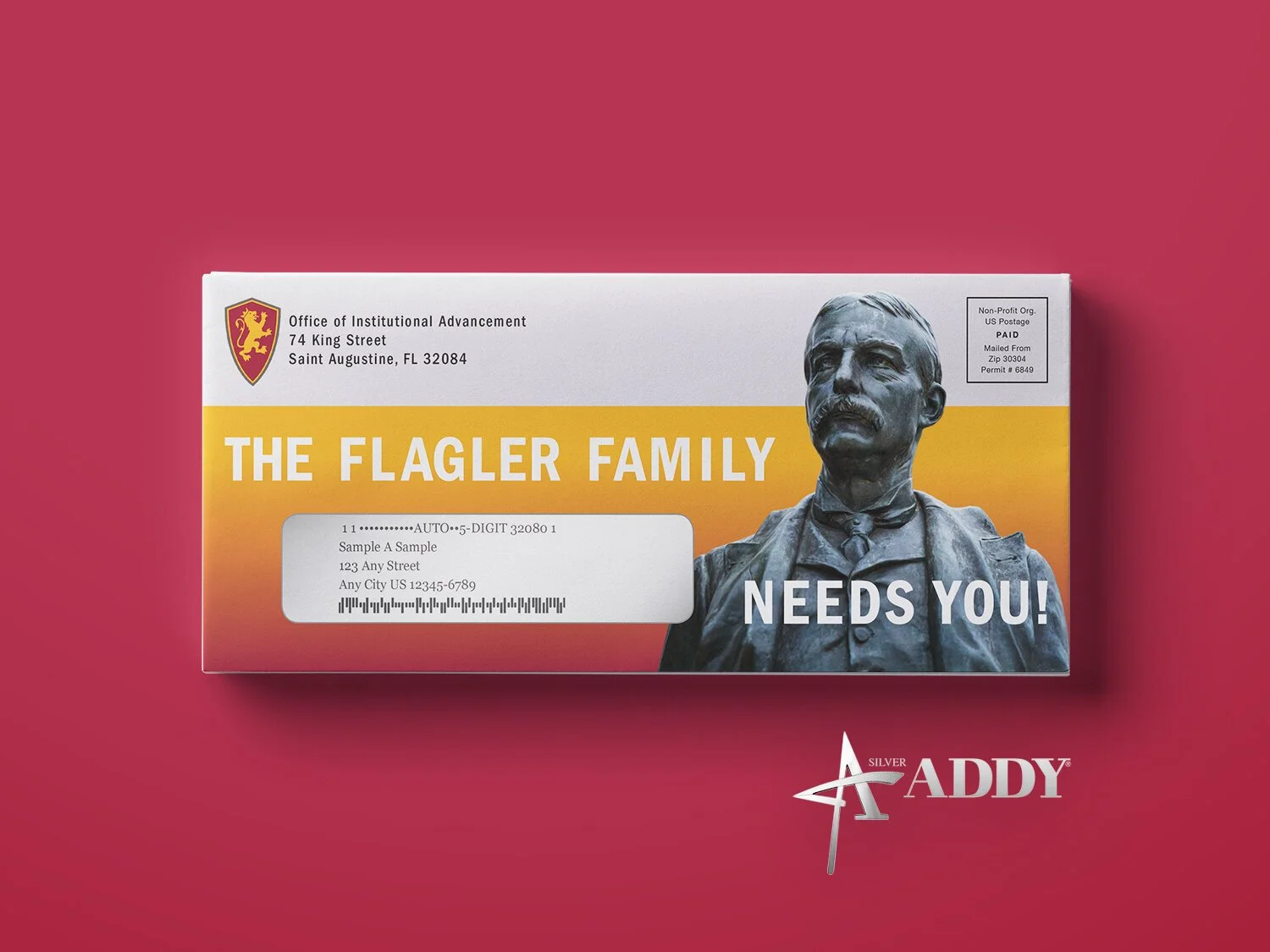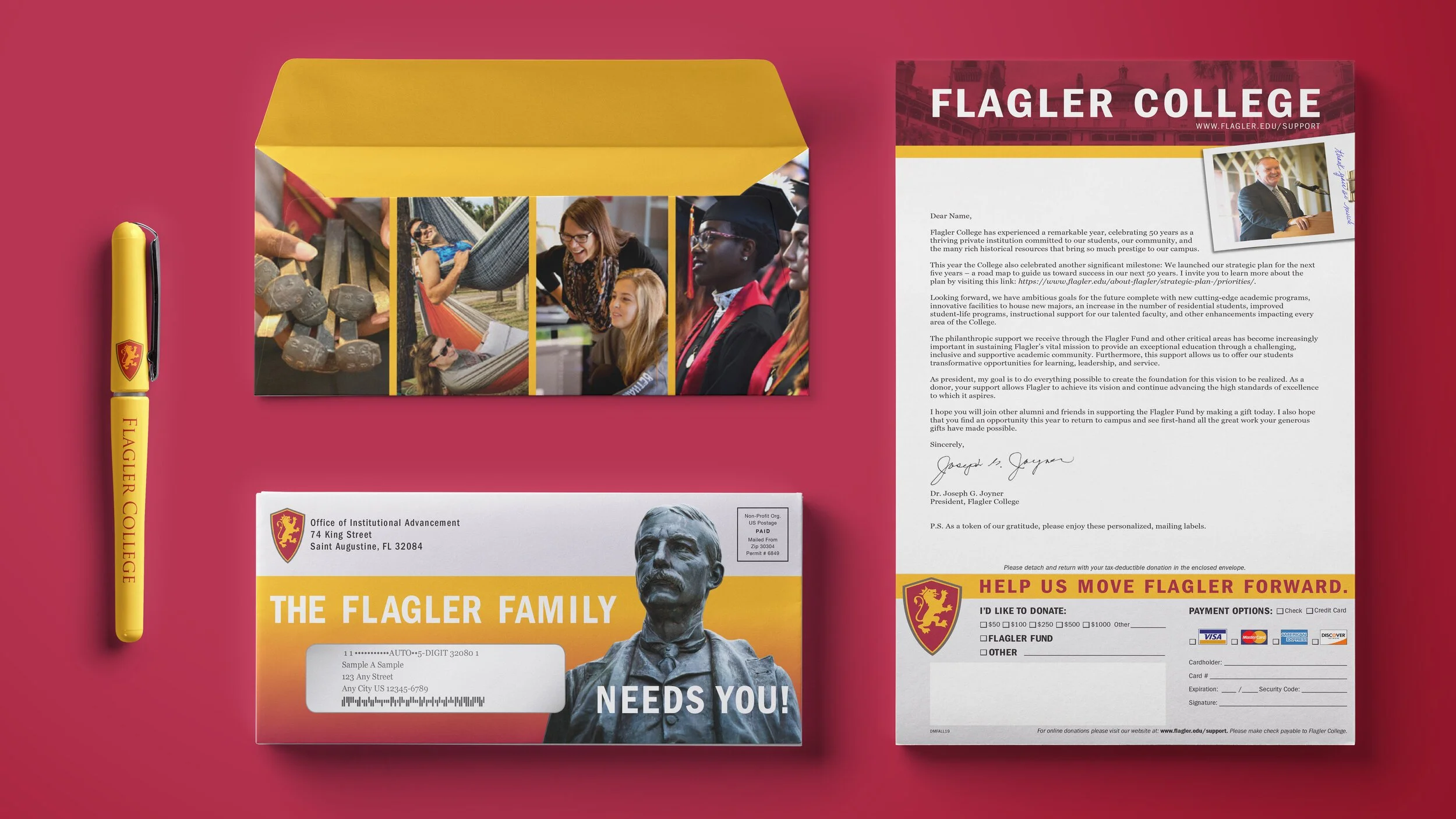 Flagler College’s Office of Institutional Advancement launched a mass direct mail project. Targeted groups include alumni, staff, and families of current students. The goal of this campaign is to support Flagler Fund, which provides scholarships to students. Included in the mailing is a letter from the President of Flagler College, Dr. Joseph Joyner. An infographic is enclosed to provide further information about the campaign. A sticker is also included in the campaign.